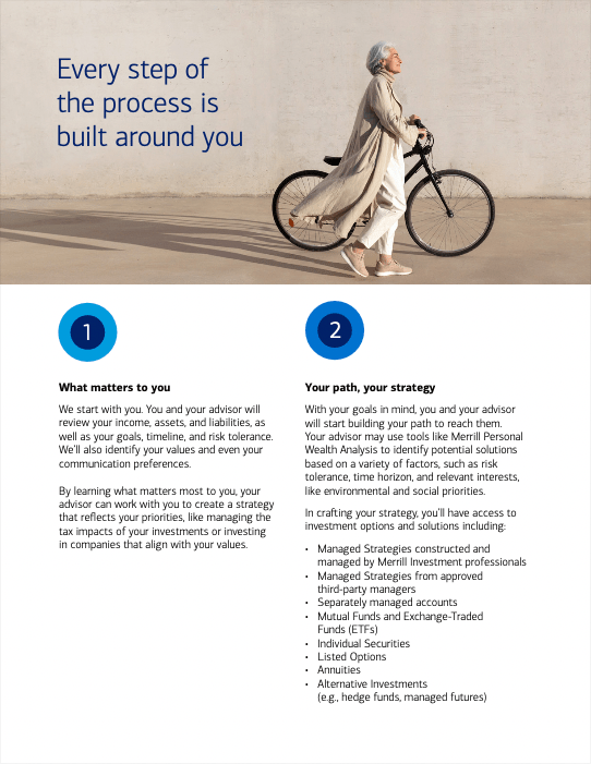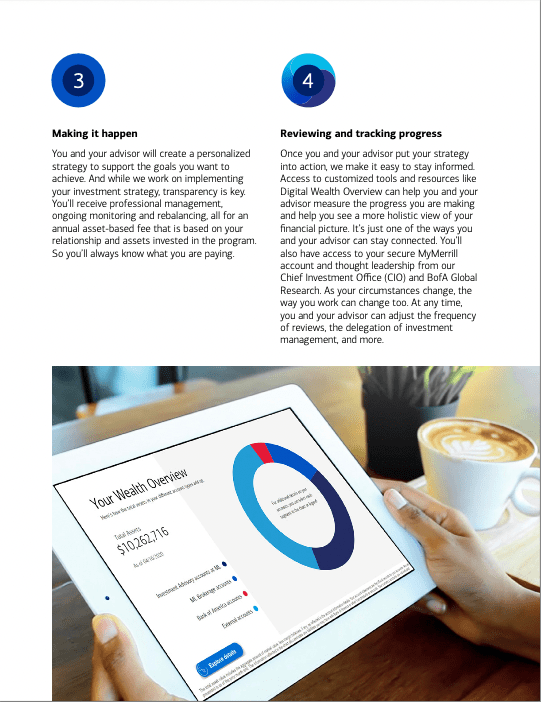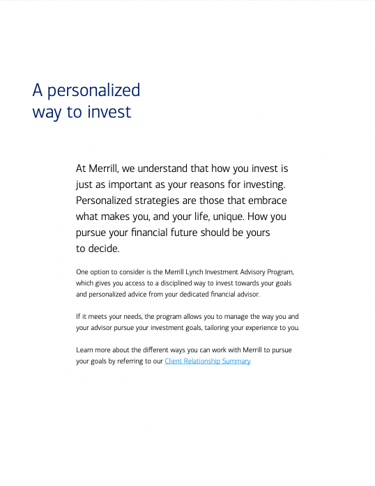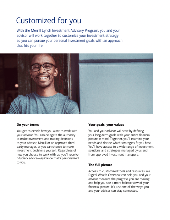 Merrill Lynch’s Investment Advisory Program offers clients the chance to tailor their investing experience to their own taste. They control the cadence of meetings with their advisor, delegation of specific portfolio aspects, and the types of assets they choose to invest in.